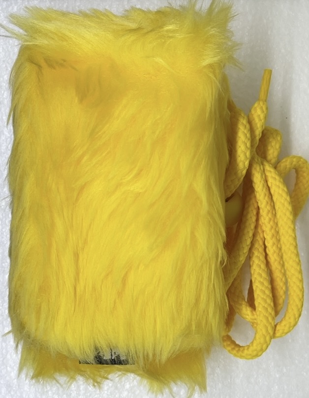 Pouzdro látkové, chlupaté, uzavírání suchým zipem, s karabinou a šňůrkou na krk, žluté.