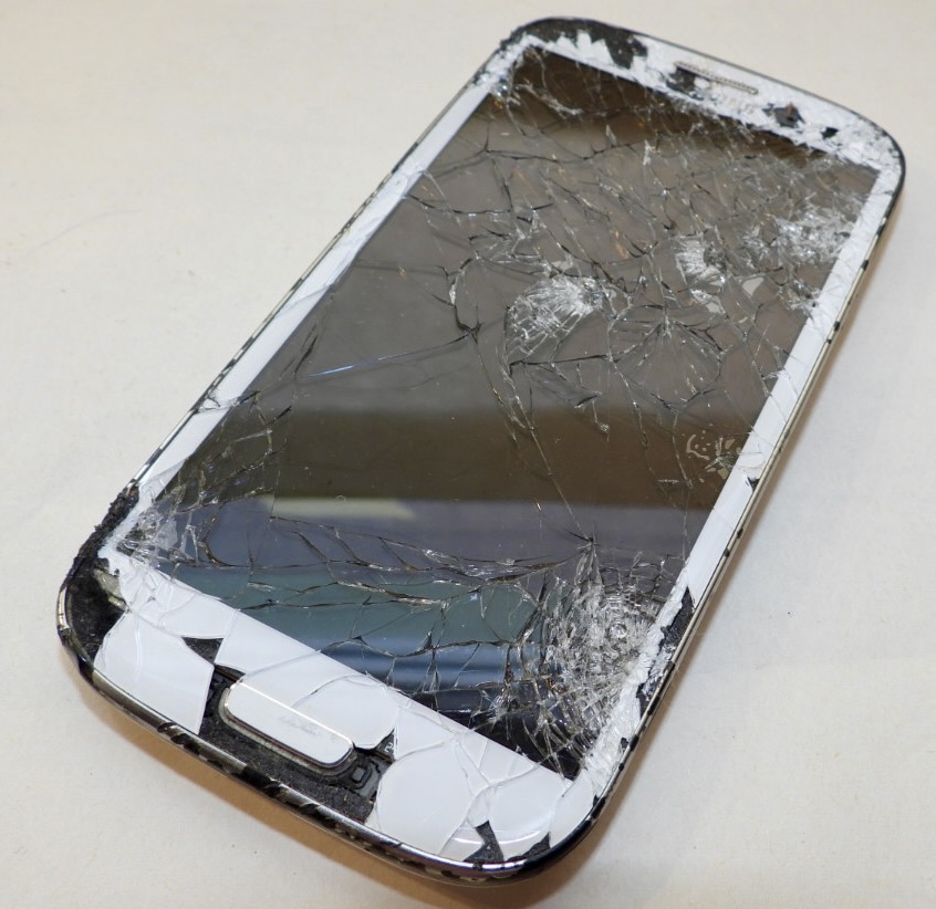 Rozbité sklo displeje, rozbitý displej. Viditelné stopy kapaliny.