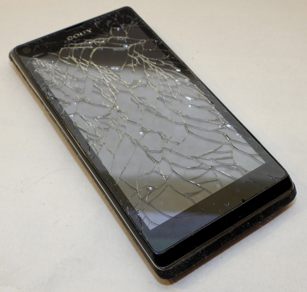 Rozbité sklo displeje, poškozený povrch plastu zadního krytu. Poškozený zadní kryt.
